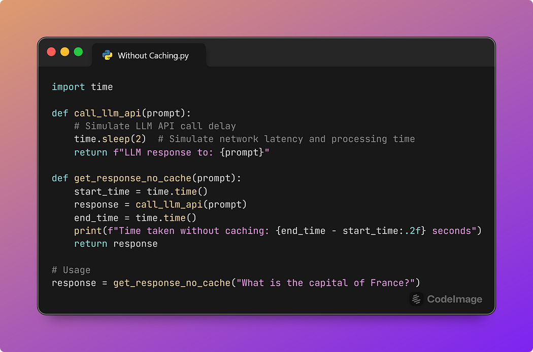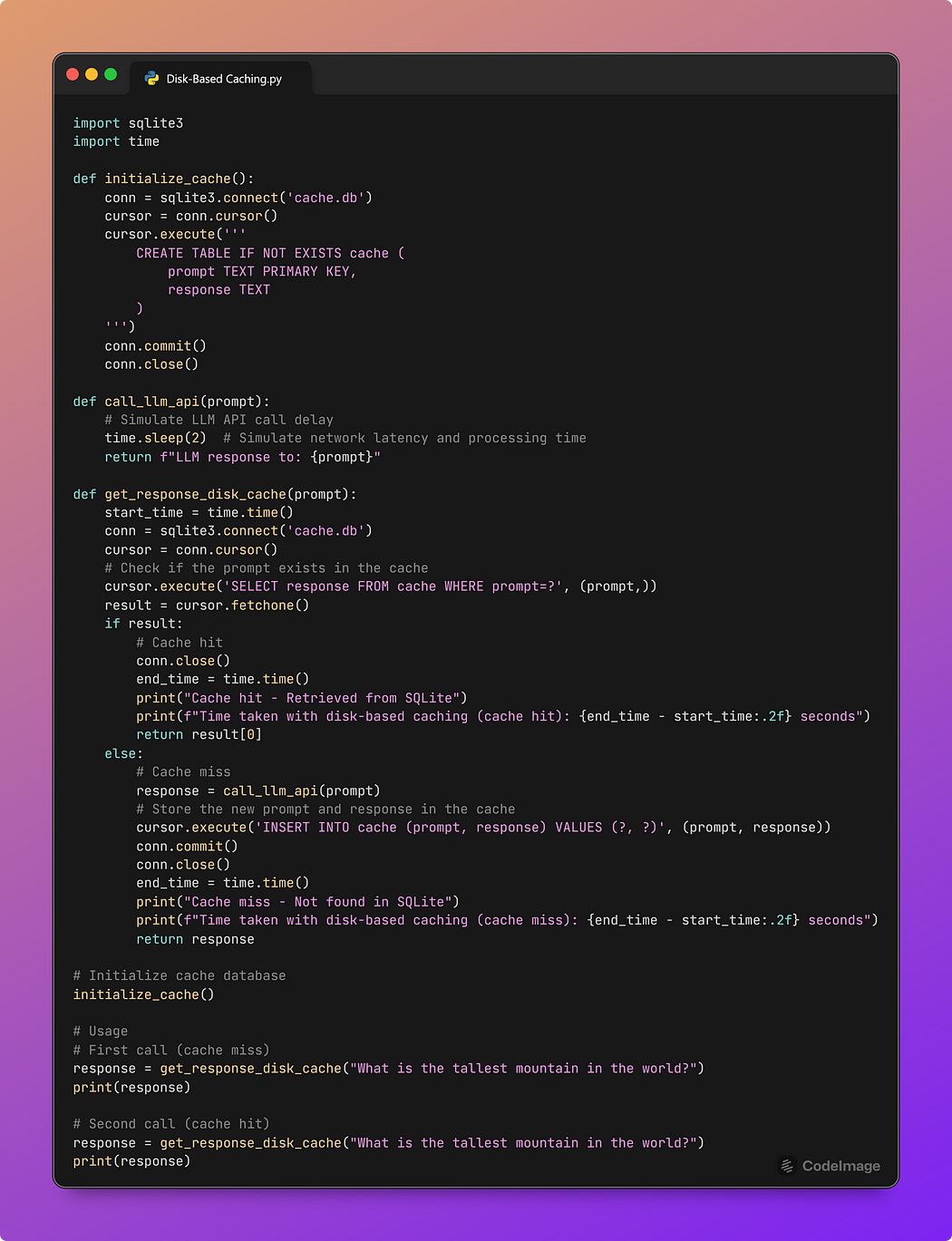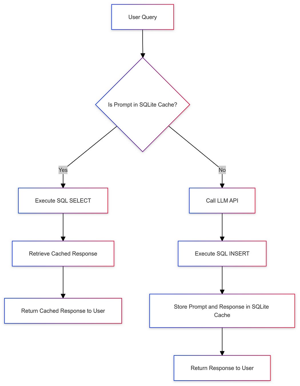 initialize_cache()function creates a SQLite database and a table namedcachewithpromptas the primary key andresponseas the stored response.Cache Check: In