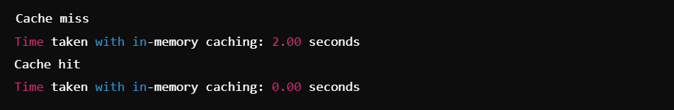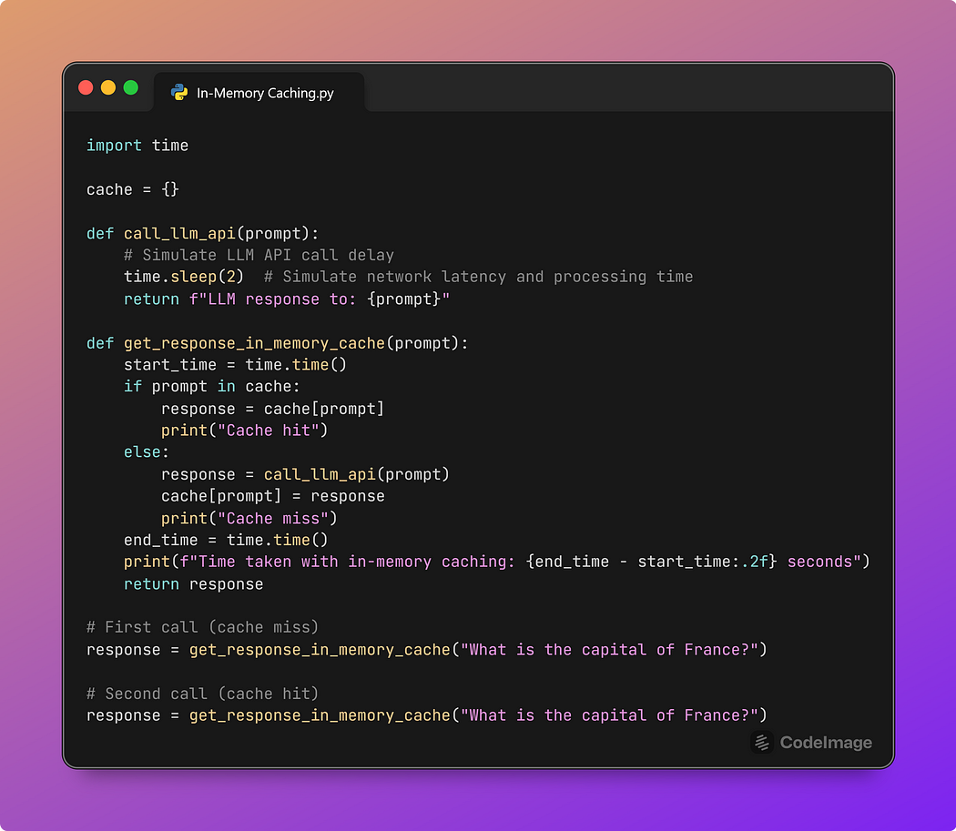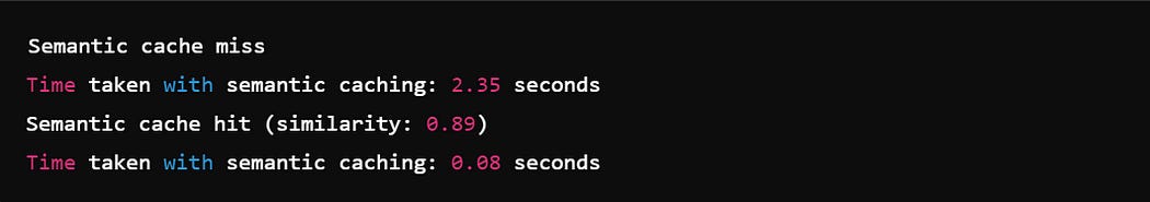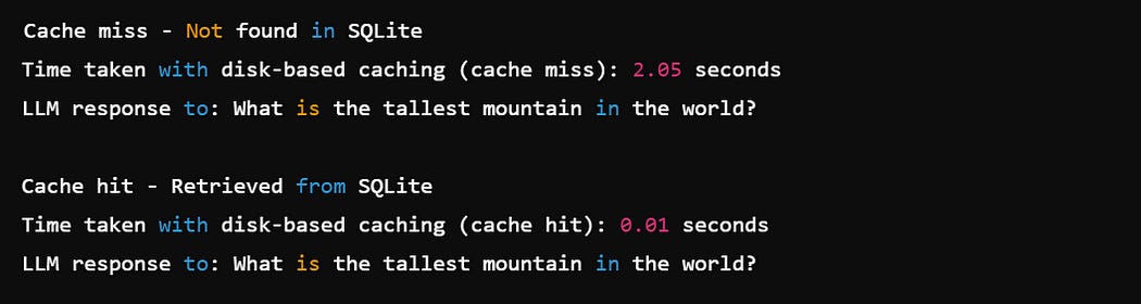 Second Call: The prompt is found in the cache, and the response is returned instantly.