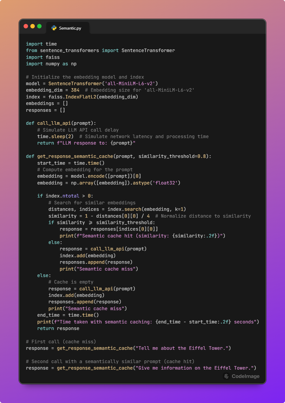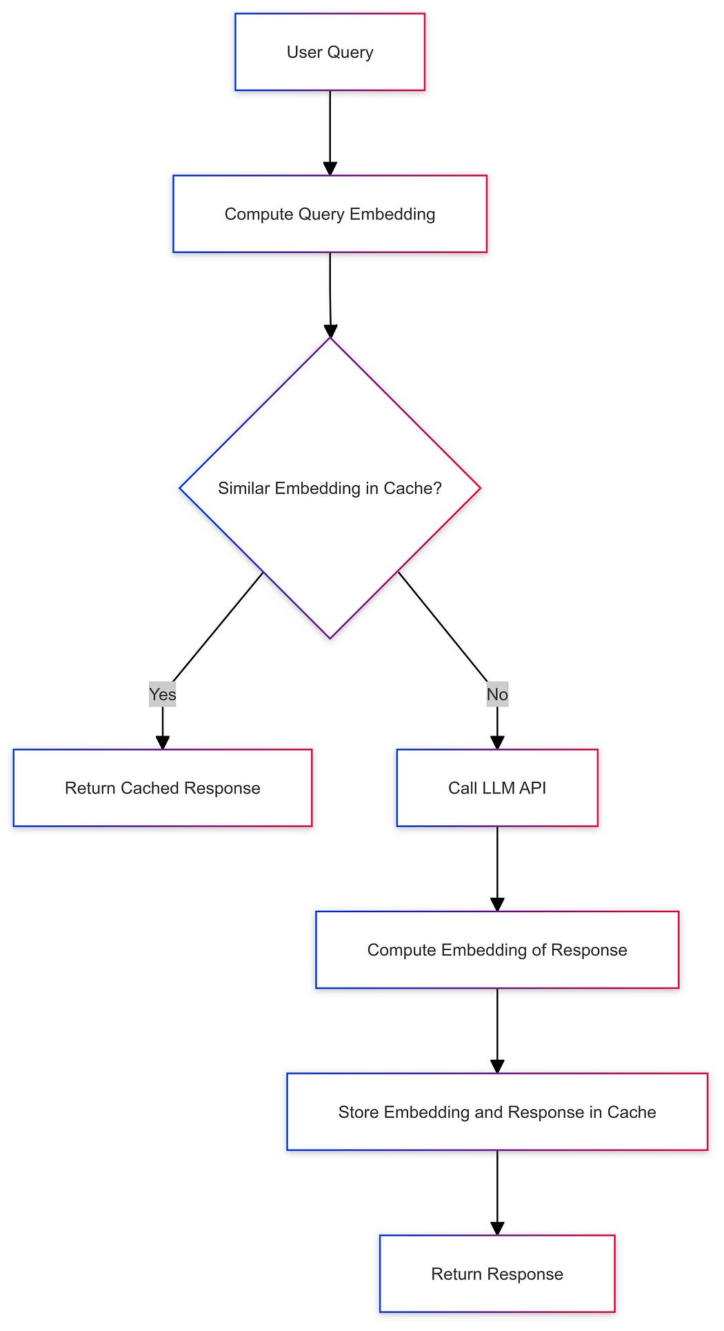 Similarity Search: When a new prompt arrives, compute its embedding and search for similar embeddings within a defined threshold.