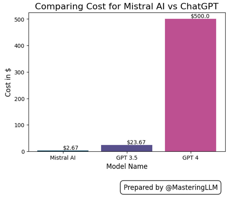 Mistral AI is ~187x cheaper than GPT 4 and ~9x cheaper than the GPT 3.5 model.